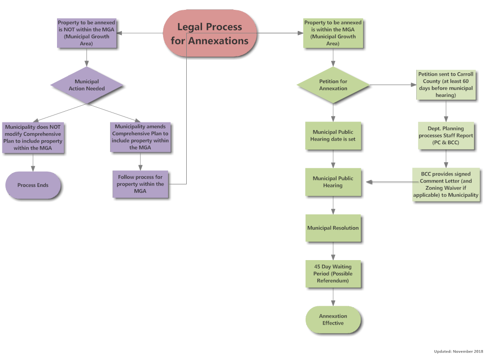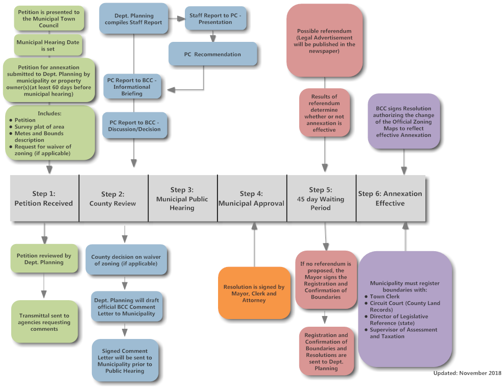 The following information and diagrams are meant to give an overview of the annexation process. The Comprehensive Planning Division makes no guarantees of legal accuracy as it relates to the reader’s individual annexation petition. All State Annexation Laws come from the Local Government Article, Division II, Title 4, Subtitle 4 (§ 4-401 through